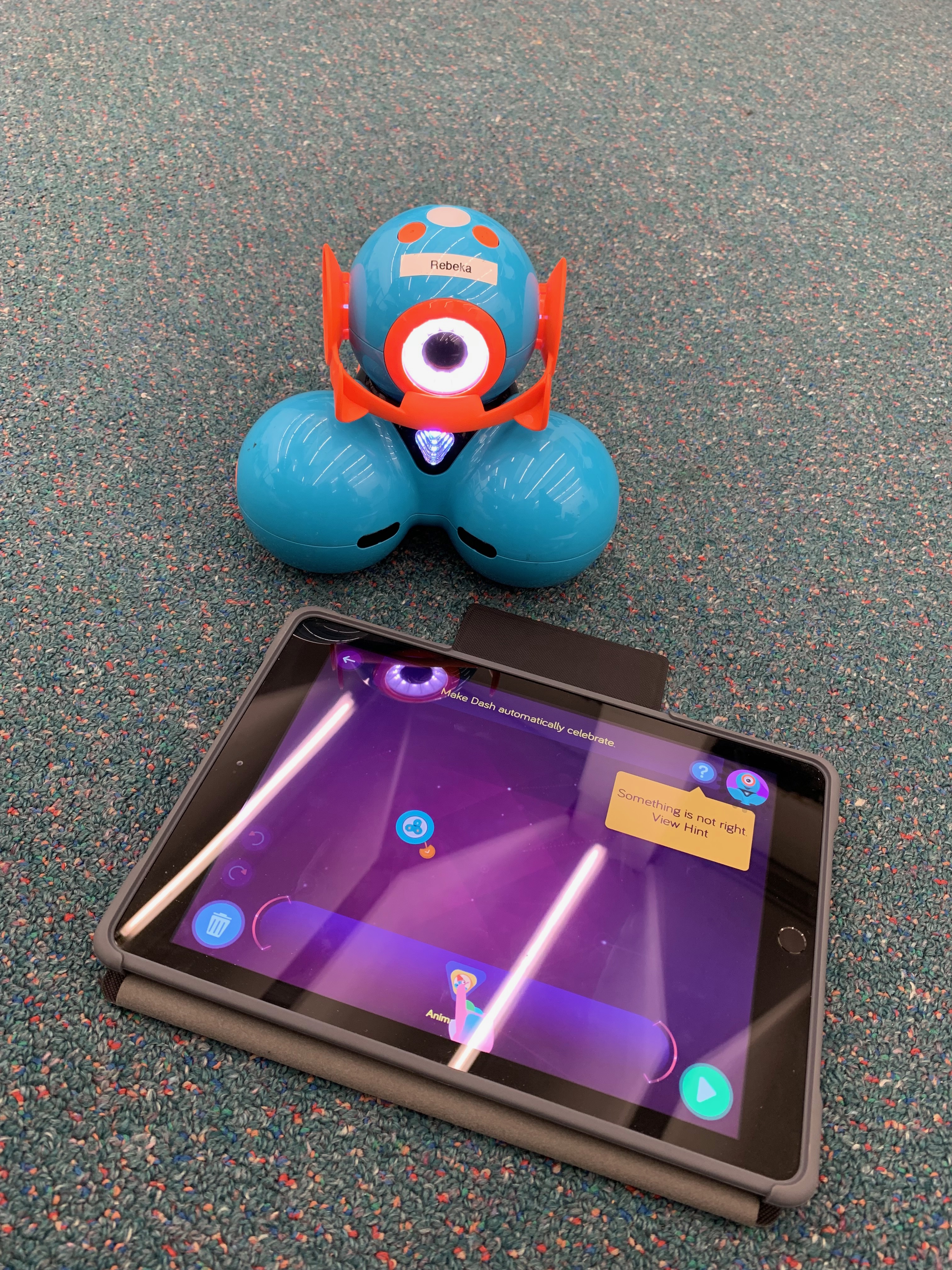 Rebeka the robot with the Dash and Dot app on an iPad.